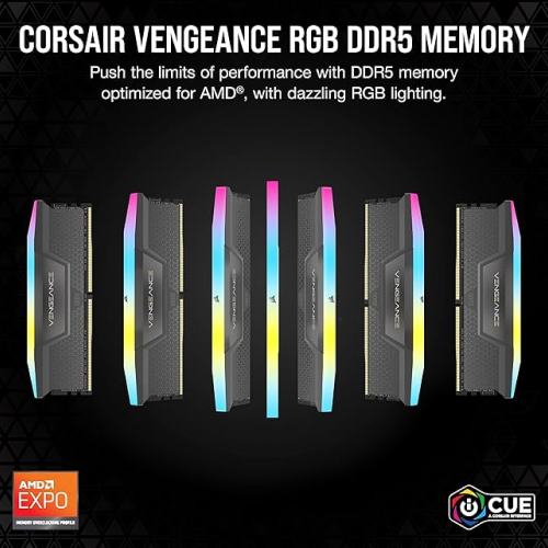 Boost your PC with the Corsair Vengeance RGB DDR5 32GB (2x16GB) 6000MHz memory kit. It fits high-end gaming rigs and tough computing tasks. This DDR5 kit brings high bandwidth and quick data speeds. It runs more efficient on new desktops. At 6000MHz, it gives fast response, short load times, and easy multitasking. Use it for games, video editing, or work projects. The 2x16GB setup boosts speed in dual-channel mode on matching boards. AMD EXPO lets you tune it with one click for better speed and settings. No need to tweak by hand. It works with Intel XMP too for broad use. Bright multi-zone RGB lights shine on each stick. Control them and sync with iCUE software across your build. A solid aluminum heat spreader keeps it cool. It stays steady during long games or heavy use.
