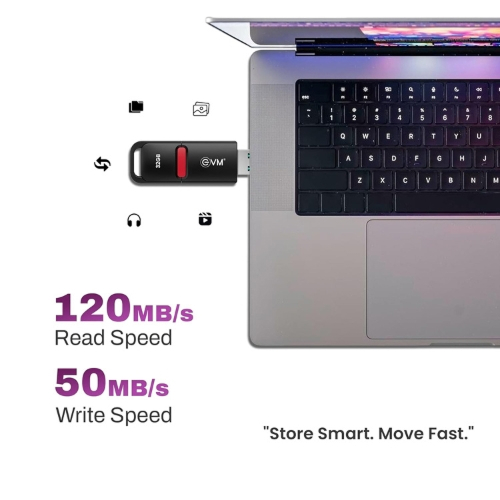 EVM ENX USB 3.2 Pen Drive (ENX/32) – 32GB The EVM ENX USB Flash Drive is a reliable storage device designed for everyday data transfer and storage needs. With a 32GB capacity, it provides sufficient space to store documents, photos, videos, and other important files. Featuring a USB 3.2 Gen 1 interface, it ensures reliable and efficient data transfer performance for regular use. Its sleek and durable design enhances reliability, while the compact form factor makes it easy to carry. The drive supports plug-and-play functionality and is compatible with laptops, desktops, and other devices with USB Type-A ports.