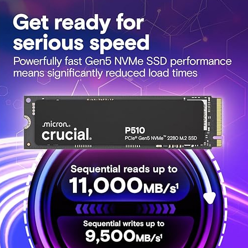 The Crucial P510 1TB M.2 NVMe PCIe Gen5 Internal SSD is built to deliver next-generation storage performance for modern desktops and laptops. Utilizing the latest PCIe Gen5 interface, it provides significantly higher bandwidth than previous generations, enabling faster data access and improved system responsiveness for demanding workloads.